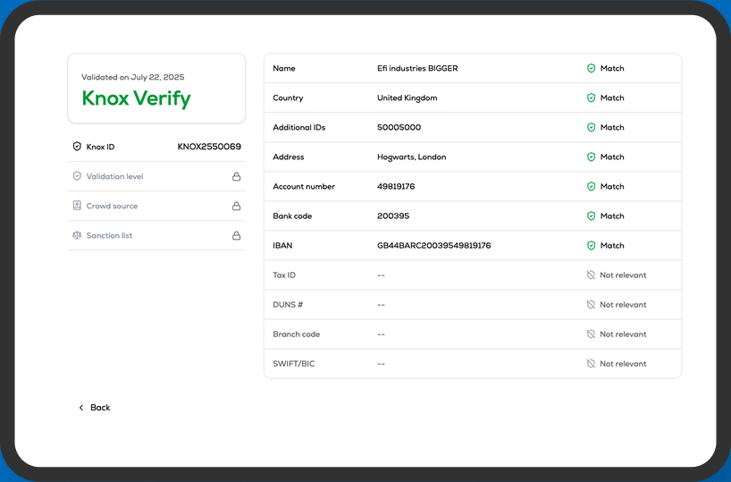 When Quick Check™ cannot fully validate an account using our in-network capabilities, or when a transaction involves a high-value payment, Knox Verify™ provides an additional layer of defense. It initiates a comprehensive, unique out-of-network mini-payment transaction to confirm account ownership directly with the supplier’s bank account, extracting authoritative banking data, and dynamically adapting to any bank or country, enabling complete global account validation.