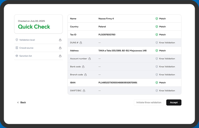 Quick Check™ provides a fast & smart in-network validation of bank account ownership by cross-referencing nsKnox’s proprietary global database and extensive partner network. This allows you to rapidly verify account information, requiring no registration by the vendor.